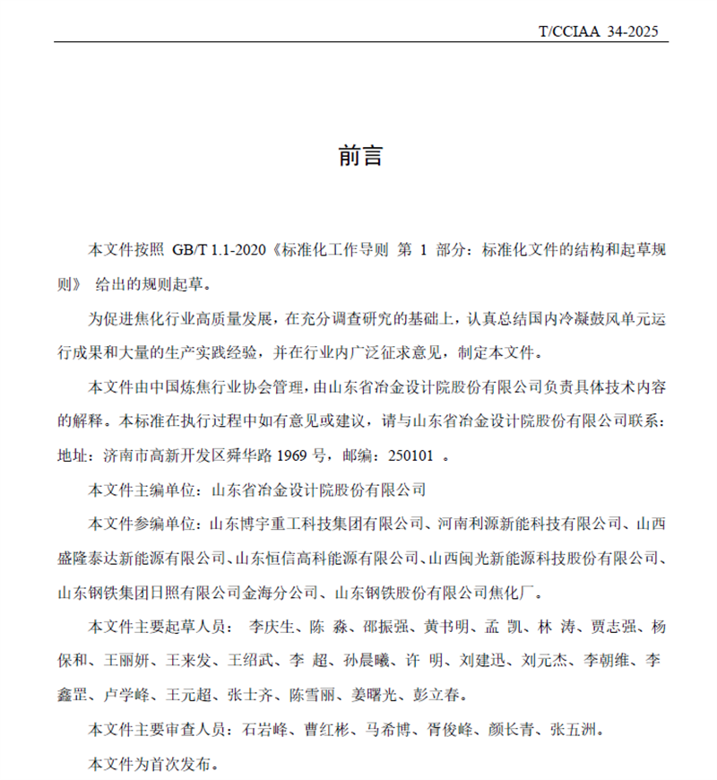 7月18日,由山冶設計主編的《焦爐煤氣初冷器工藝技術(shù)規(guī)范》T/CCIAA 34-2025(簡稱《規(guī)范》)正式發(fā)布并實施?!兑?guī)范》對焦化煤氣凈化初冷器的工藝流程、操作參數(shù)以及質(zhì)量指標作出了詳細規(guī)定,同時統(tǒng)一了初冷器的設計與操作標準,保障了煤氣冷卻過程的高效性與安全性?!兑?guī)范》的發(fā)布與實施,可指導焦化企業(yè)在生產(chǎn)過程中有效把控初冷器的日常操作,為后續(xù)煤氣凈化及深加工的穩(wěn)定運行創(chuàng)造有利條件。這是繼2024年7月1日正式實施、山冶設計主編的《焦爐煤氣脫硫廢液干法制酸技術(shù)規(guī)范》YB/T6115 - 2023之后的又一個行業(yè)規(guī)范,充分體現(xiàn)了山冶設計在焦化行業(yè)的技術(shù)引領作用與品牌影響力。