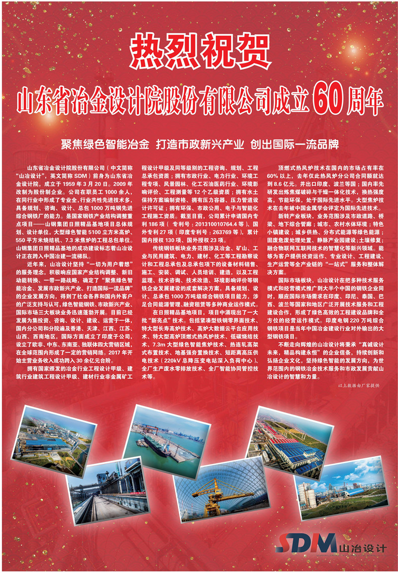 熱烈祝賀山東省冶金設(shè)計院股份有限公司成立60周年